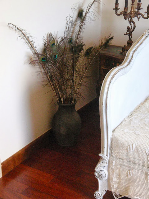 Miejsce znalazły tu: robiony przeze mnie fotel, francuska komoda - prezent od szwagra. krzesło od mojej przyjaciółki , wiktoriański stolik, zakupiony na toaletkę 20 lat temu w "antykarni", kawałek rzeźby ze starego okna, które nabyłam "za flaszkę" od budowlańców, mała lampka naftowa i gliniany dzbanek przywiezione z działki. No i oczywiście kwiatowa komódka.